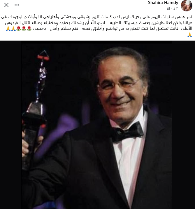 وفي هذه المناسبة الأليمة، حرصت الفنانة شهيرة على أن تكون كلماتها رسالة موجهة مباشرة لروحه، رسالة «مليئة بالحب والاشتياق والفقد الكبير» الذي لا يزال يخيم على حياتها وحياة أبنائها بعد غياب «حبيب العمر».