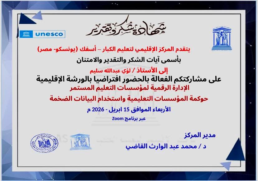 كان الأستاذ لؤي عبدالله سليم، قد شارك بـ "الورشة الإقليمية" لمركز تعليم الكبار آسفك "يونسكو مصر " عبر برنامج زووم ، تحت عنوان : [ الإدارة الرقمية لمؤسسات التعليم المستمر ، حكومة المؤسسات التعليمية واستخدام البيانات الضخمة ] .